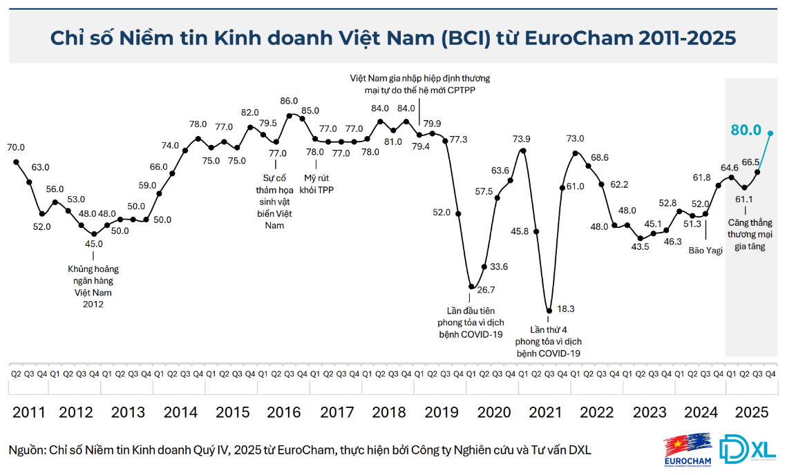 | Chỉ số BCI Quý 4/2025 được Eurocham công bố đạt 80 điểm, là mức cao nhất trong vòng 7 năm qua |