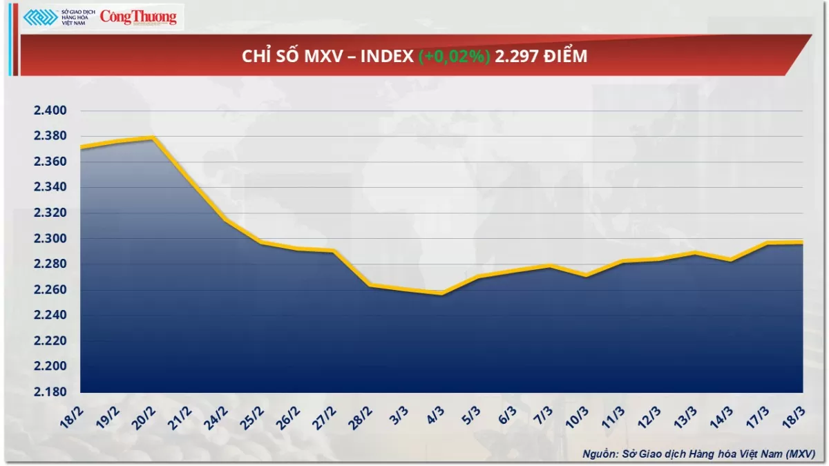 Theo Sở Giao dịch Hàng hóa Việt Nam (MXV), thị trường hàng hóa nguyên liệu thế giới diễn biến phân hóa trong phiên giao dịch ngày hôm qua (18/2). Đóng cửa, chỉ số MXV-Index tăng nhẹ 0,02% lên mức 2.297 điểm. Đáng chú ý, thị trường kim loại có tới 7 trên 10 mặt hàng giá đồng loạt tăng, trong đó giá bạc tăng lên mức cao nhất 5 tháng qua. Ở chiều ngược lại, lực bán áp đảo trên thị trường năng lượng, giá hai mặt hàng dầu thô quay đầu giảm 1%.