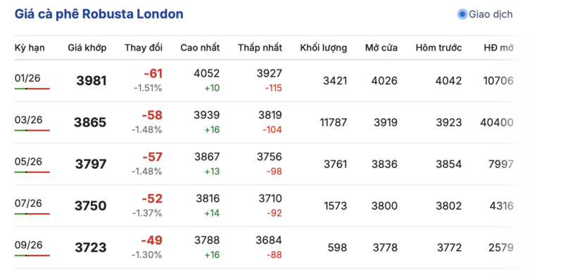 Tương tự, trên sàn New York, giá cà phê Arabica cũng ghi nhận giảm mạnh liên tục trong các kỳ giao hàng. Cụ thể, kỳ giao tháng 12/2025 giảm 5,15 cent/lb, đạt mức 382,55 cent/lb. Hợp đồng giao tháng 9/2026 giảm 4,65 cent/lb, đạt mức 319,65 cent/lb.