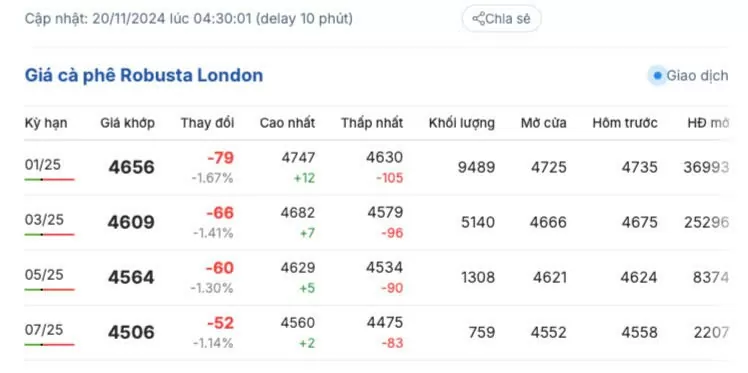 Giá cà phê Robusta trên sàn Lon don cập nhật ngày 20/11/2024