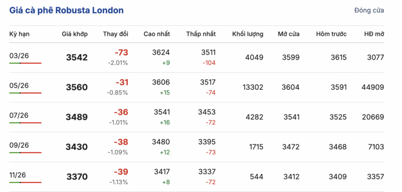 Kết thúc phiên giao dịch gần nhất, giá cà phê Robusta tại London tiếp tục ghi nhận phiên giảm nhẹ đồng loạt trong các kỳ giao hàng. Cụ thể, kỳ giao tháng 1/2026 giảm 73 USD/tấn, đạt mức 3542 USD/tấn. Trong khi đó, hợp đồng giao kỳ hạn tháng 11/2026 cũng giảm nhẹ 39 USD/tấn, xuống mức 3370 USD/tấn.