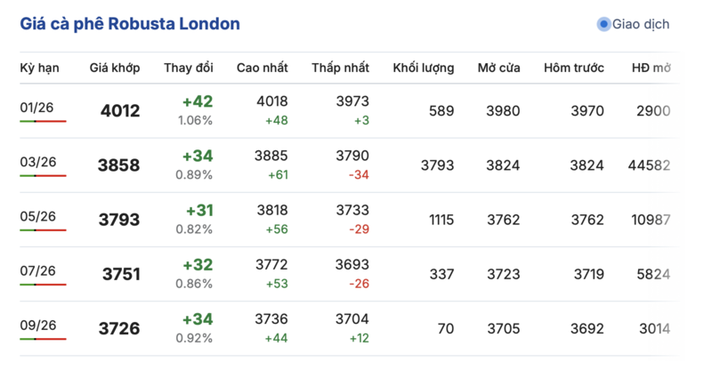 Kết thúc phiên giao dịch gần nhất, giá cà phê Robusta tại London tiếp tục tăng nhẹ đồng loạt trong các kỳ giao hàng. Cụ thể, kỳ giao tháng 1/2026 tăng 42 USD/tấn, lên mức 4012 USD/tấn. Hợp đồng giao kỳ hạn tháng 9/2026 tăng 34 USD/tấn, lên mức 3726 USD/tấn.
