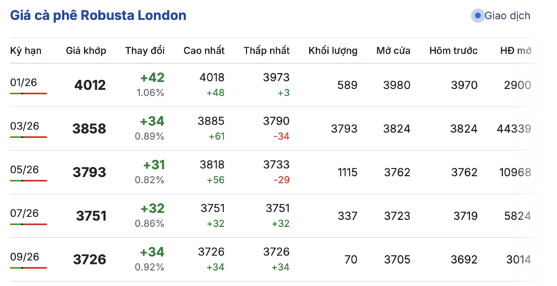 Kết thúc phiên giao dịch gần nhất, giá cà phê Robusta tại London tiếp tục tăng nhẹ đồng loạt trong các kỳ giao hàng. Cụ thể, kỳ giao tháng 1/2026 tăng 42 USD/tấn, lên mức 4012 USD/tấn. Hợp đồng giao kỳ hạn tháng 9/2026 tăng 34 USD/tấn, lên mức 3726 USD/tấn.