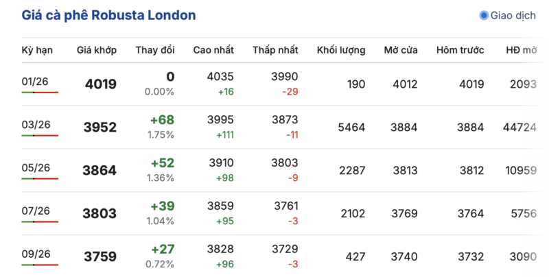 Kết thúc phiên giao dịch gần nhất, giá cà phê Robusta tại London tiếp tục tăng nhẹ đồng loạt trong các kỳ giao hàng. Cụ thể, kỳ giao tháng 3/2026 tăng 68 USD/tấn, lên mức 3952 USD/tấn. Hợp đồng giao kỳ hạn tháng 9/2026 tăng 27 USD/tấn, lên mức 3759 USD/tấn.