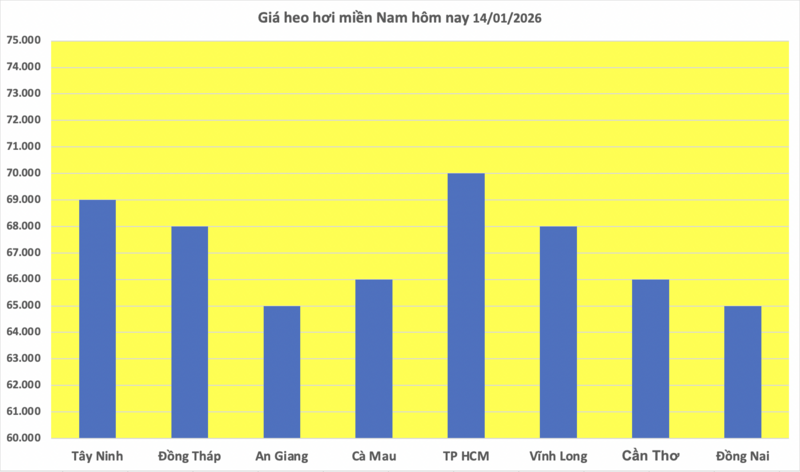 Ghi nhận mức tăng mạnh nhất khu vực là 2.000 đồng/kg tại hai tỉnh Đồng Tháp và Vĩnh Long, cùng đạt mức thu mua 68.000 đồng/kg. Các địa phương trọng điểm như Đồng Nai và TP. Hồ Chí Minh cùng tăng thêm 1.000 đồng/kg, chính thức chạm mốc 70.000 đồng/kg.