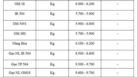Tương tự với mặt hàng lúa, theo cập nhật từ Sở Nông nghiệp và Môi trường tỉnh An Giang, hiện giá lúa IR 50404 (tươi) dao động ở mức 5.700 - 5.900 đồng/kg; giá lúa Nàng Hoa 9 dao động ở mức 6.000 - 6.200 đồng/kg; giá lúa Đài Thơm 8 (tươi) dao động ở mốc 6.100 - 6.200 đồng/kg; giá lúa OM 18 (tươi) dao động ở mốc 6.000 - 6.200 đồng/kg; giá lúa OM 5451 (tươi) dao động mốc 5.900 - 6.000 đồng/kg; giá lúa (tươi) OM 308 dao động ở mức 5.700 - 5.900 đồng/kg so với hôm qua.