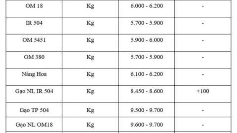 Với mặt hàng gạo, theo cập nhật từ Sở Nông nghiệp và Môi trường tỉnh An Giang, hiện gạo nguyên liệu xuất khẩu IR 504 giảm 50 đồng/kg dao động ở mức 8.500 - 8.600 đồng/kg; gạo nguyên liệu xuất khẩu OM 380 giảm 100 đồng/kg dao động ở mức 8.200 - 8.300 đồng/kg; gạo nguyên liệu 5451 dao động ở mức 9.500 - 9.650 đồng/kg;; gạo nguyên liệu CL 555 dao động ở mức 8.650 - 8.750 đồng/kg; gạo nguyên liệu OM 18 dao động ở mức 9.600 - 9.700 đồng/kg; gạo thành phẩm OM 380 dao động ở 8.800 - 9.000 đồng/kg; gạo thành phẩm IR 504 dao động ở 9.500 - 9.700 đồng/kg.