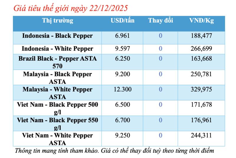 Trong khi đó, giá tiêu thị trường trong nước hôm nay (22/12) không thay đổi so với phiên giao dịch trước. Giá tiêu nội địa dao động từ 147.000 - 149.000 đồng/kg.
