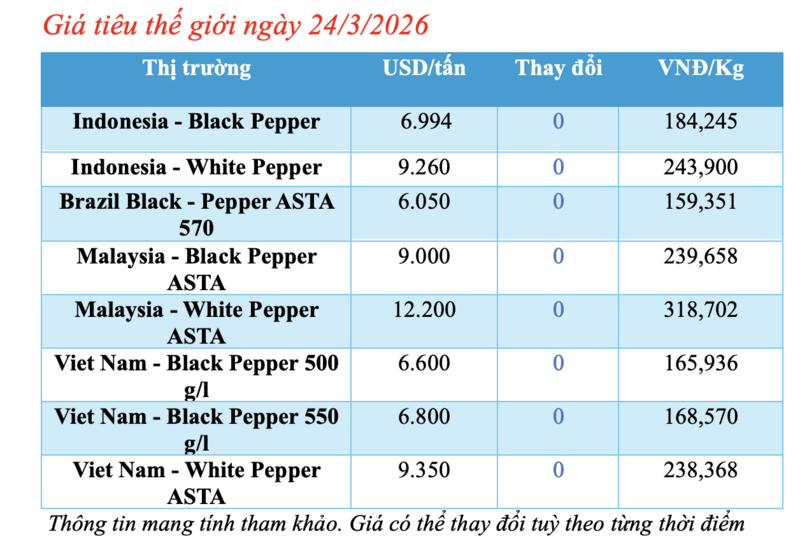 Tại Malaysia, giá tiêu đen ASTA hiện đang ổn định ở mức 9.000 USD/tấn. Giá tiêu trắng ASTA tại thị trường này trong ngày hôm nay đạt 12.200 USD/tấn, không biến động so với ngày hôm qua.