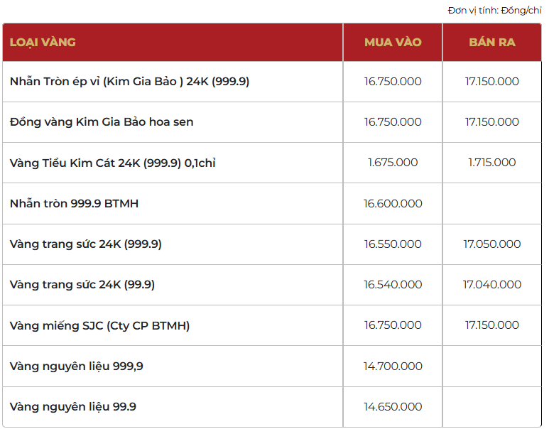Bảo Tín Mạnh Hải niêm yết giá nhẫn tròn ép vỉ Kim Gia Bảo ở mức 168,5 - 171,5 triệu đồng/lượng (mua vào - bán ra), giảm 2,5 triệu đồng/lượng cả hai chiều mua vào và bán ra so với chốt phiên giao dịch trước.