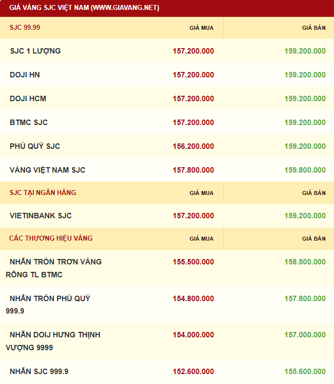 Giá vàng miếng được Công ty TNHH MTV Vàng bạc đá quý Sài Gòn - SJC, Bảo Tín Minh Châu, PNJ, Tập đoàn DOJI cùng niêm yết giá vàng ở mức 157,2-159,2 triệu đồng/lượng (mua vào - bán ra), mức giá tăng 200.000 đồng/lượng ở cả hai chiều mua - bán so với hôm qua. Chênh lệch giá mua vào - bán ra ở mức 2 triệu đồng.