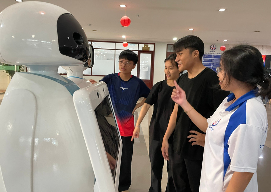 Sinh viên Trường Đại học Kỹ thuật Công nghệ TPHCM tìm hiểu hoạt động robot. Ảnh: Hà An