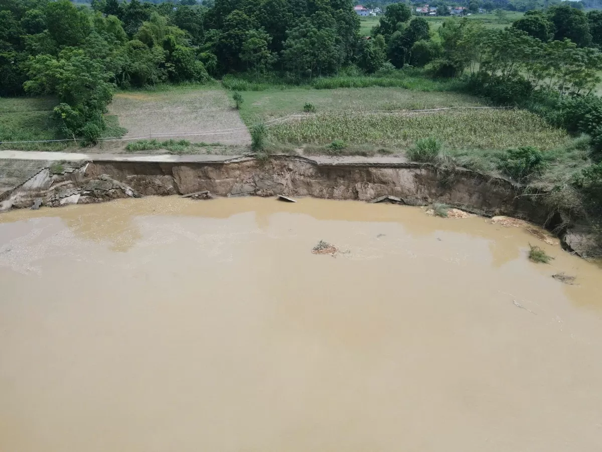 Sự cố làm sập một phần công trình kè và đường vận hành phía hạ lưu. Trong đó, chiều dài sạt lở 71m, chiều rộng sạt lở 20,5m; đường vận hành bị sạt lở 15m2, phạm vi sạt lở hiện tại đang tiếp tục có diễn biến phát triển thêm. Ảnh: CTV |