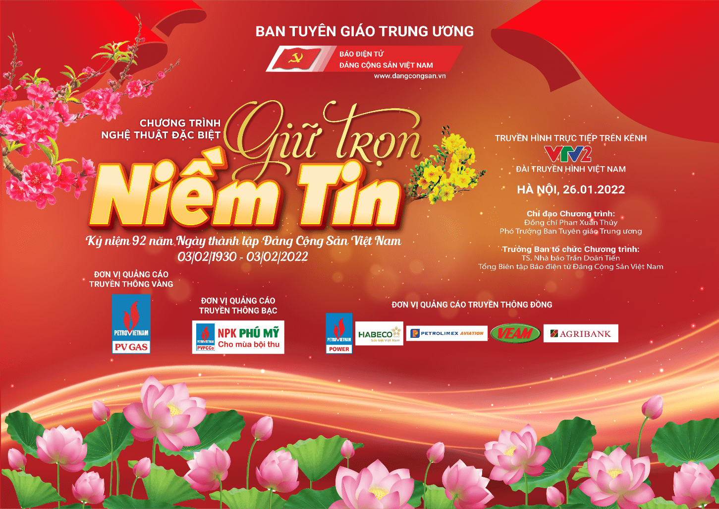 Ngày 26/01 sắp tới, tại Nhà Hát lớn Hà Nội sẽ diễn ra chương trình nghệ thuật đặc biệt “Giữ trọn niềm tin” do Báo Điện tử Đảng Cộng sản tổ chức nhân dịp kỷ niệm 92 năm ngày thành lập Đảng (3/2/1930 - 3/2/2022).