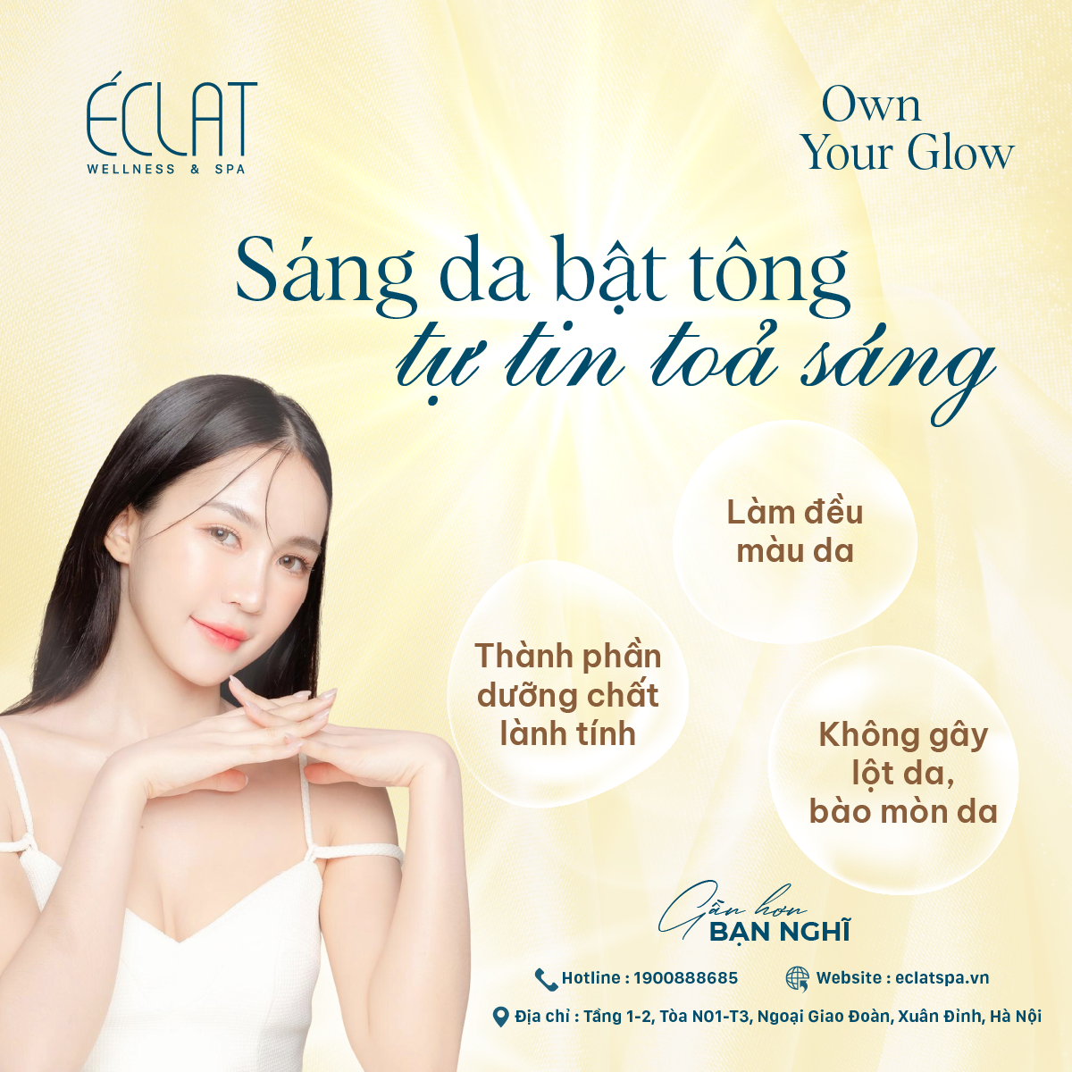 Với dịch vụ tắm trắng và dưỡng sáng da toàn thân tại Eclat, bạn không chỉ có được làn da trắng sáng, khỏe mạnh mà còn được trải nghiệm những giây phút thư giãn tuyệt vời. Đừng ngần ngại liên hệ ngay với Éclat để được tư vấn và trải nghiệm liệu trình dưỡng sáng da toàn thân, tự tin tỏa sáng với làn da mơ ước của chính mình nhé!
