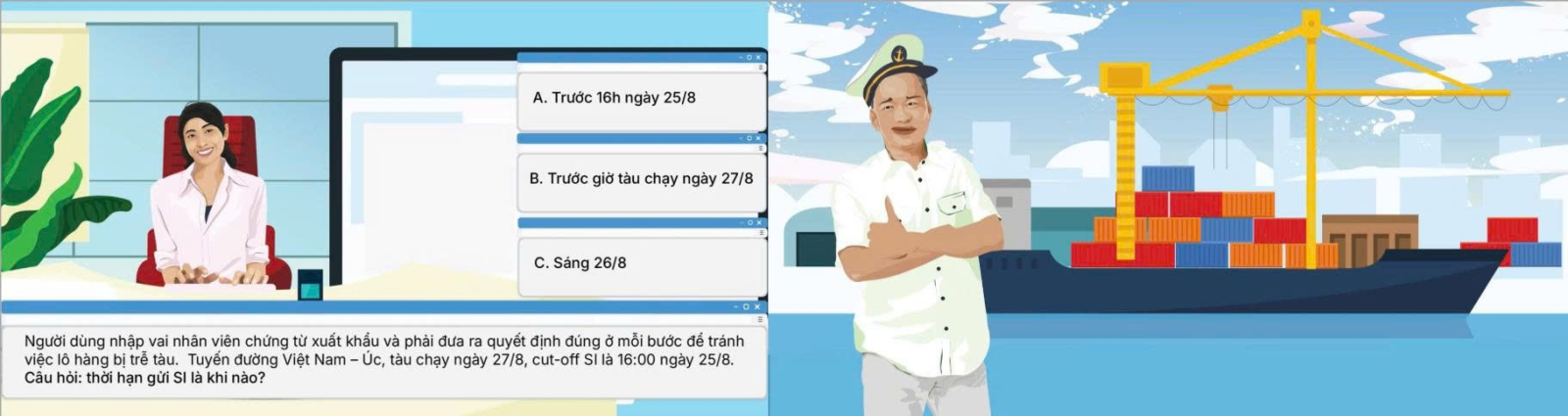 Trải nghiệm mô phỏng 2D: Người học được nhập vai vào các nghiệp vụ như quản lý kho, điều phối vận tải, xử lý chứng từ, chăm sóc khách hàng… Mọi thao tác đều được ghi nhận và phân tích, giúp chuyển từ “hiểu lý thuyết” sang “làm được việc”.