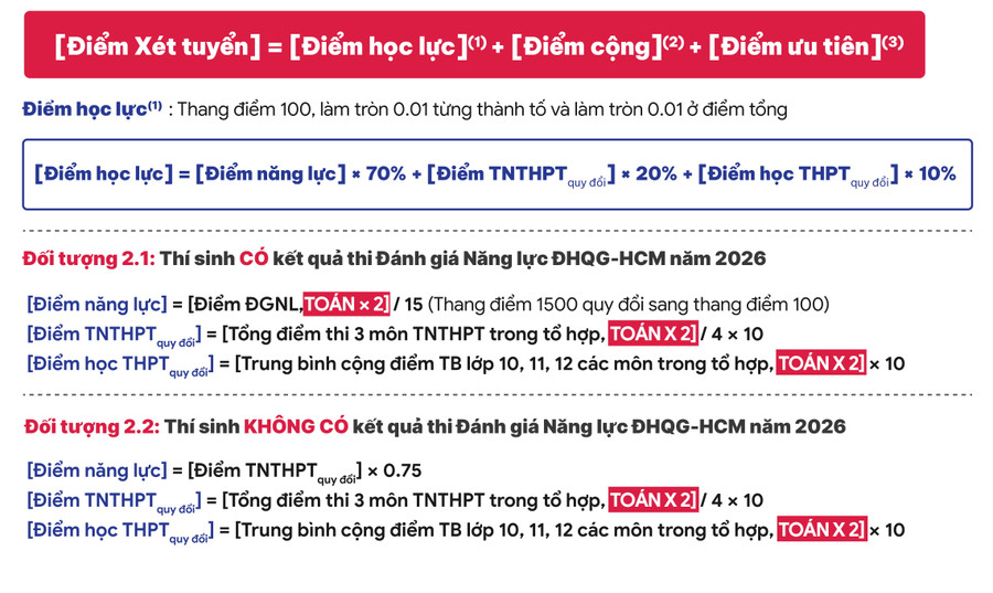 Sang năm 2026, việc nhân đôi được mở rộng cho hai thành phần còn lại là điểm thi tốt nghiệp THPT và điểm học THPT. Đây là bước tiếp nối trong lộ trình lấy môn Toán làm trọng tâm đánh giá đầu vào.