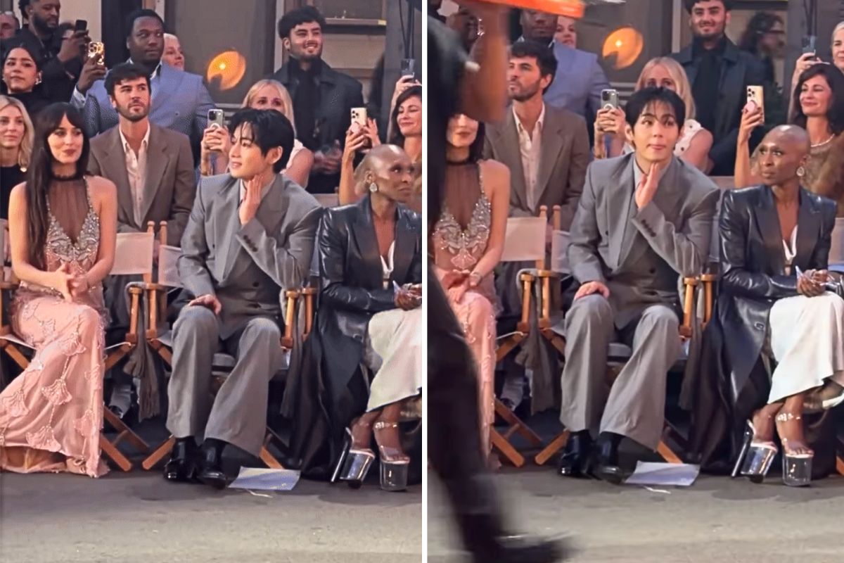 Tại đêm diễn, V ngồi hàng ghế đầu, bên cạnh là hai diễn viên Dakota Johnson và Cynthia Erivo. Hình ảnh V chụp cùng mỹ nhân Dakota Johnson đã gây bão, khiến người hâm mộ thỏa mãn bởi “bữa tiệc nhan sắc”.