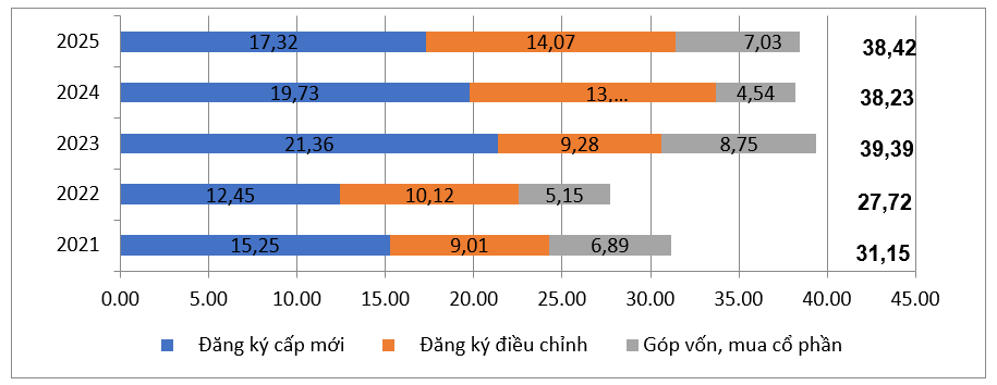 Theo Cục Thống kê, tổng vốn đầu tư nước ngoài đăng ký vào Việt Nam tính đến ngày 31/12/2025 bao gồm: Vốn đăng ký cấp mới, vốn đăng ký điều chỉnh và giá trị góp vốn, mua cổ phần của nhà đầu tư nước ngoài đạt 38,42 tỷ USD, tăng 0,5% so với năm trước.