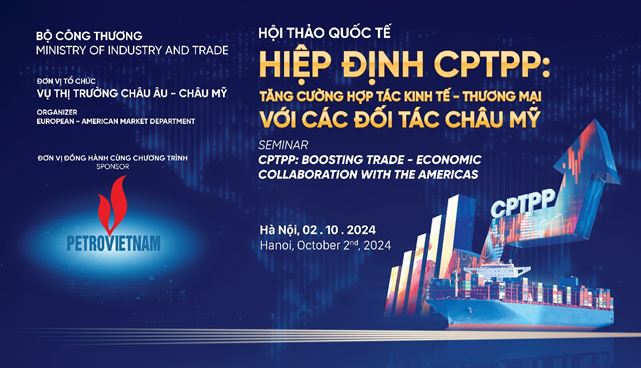Thực hiện Quyết định 2382⁄QĐ-BCT ngày 05 tháng 9 năm 2024, Bộ Công Thương giao Vụ Thị trường châu Âu – châu Mỹ chủ trì, phối hợp với các đơn vị liên quan tổ chức Hội thảo quốc tế “Hiệp định CPTPP: Tăng cường hợp tác kinh tế - thương mại với các đối tác Châu Mỹ” vào lúc 8h00 – 12h00, ngày 02 tháng 10 năm 2024 Tại Tầng 2, Khách sạn Pullman, Số 61 Giảng Võ, Ba Đình, Hà Nội. Chương trình hân hạnh có sự đồng hành của: Tập đoàn Dầu khí Việt Nam (PVN).