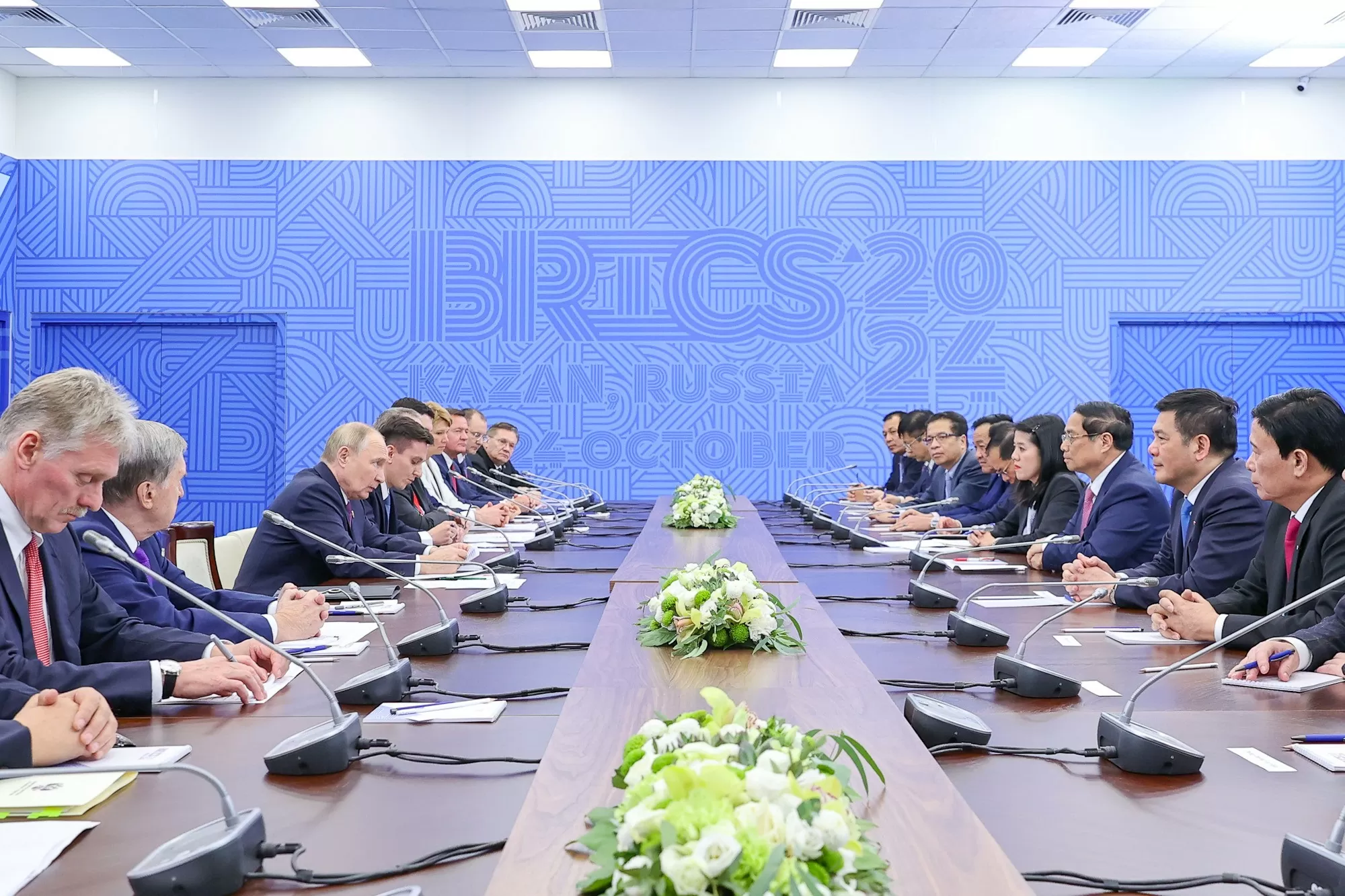 Trong khuôn khổ tham dự Hội nghị các Nhà lãnh đạo Nhóm BRICS mở rộng 2024 tại Kazan, Liên Bang Nga, tối 24/10 (theo giờ địa phương), Thủ tướng Chính phủ Phạm Minh Chính đã có cuộc hội đàm với Tổng thống Liên Bang Nga Vladimir Putin.