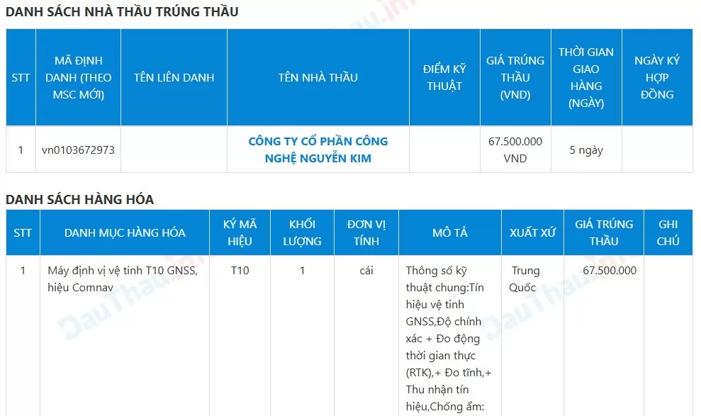 Giá gói thầu là 67,5 triệu đồng, giá trúng thầu cũng là 67,5 triệu đồng. Danh mục hàng hóa của gói thầu này chỉ là 1 Máy định vị vệ tinh T10 GNSS, hiệu Comnav. Sản phẩm có xuất xứ Trung Quốc.