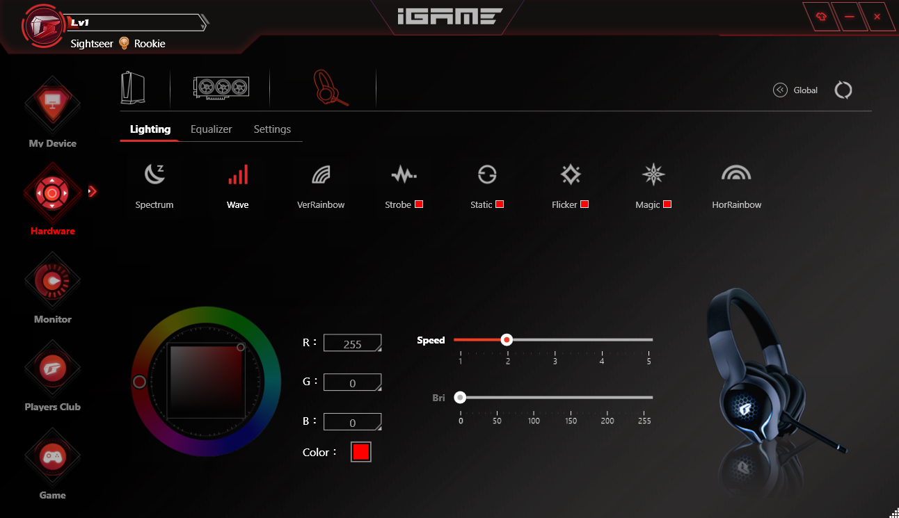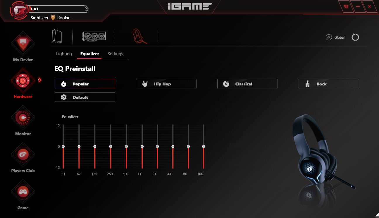 Tại đây ta có thể chỉnh âm thanh bằng EQ, bật tắt chống ồn môi trường của microphone, chỉnh màu sắc và hiệu ứng của đèn nền bên ngoài và đáng nói nhất là chuyển giữa 2 chế độ âm thanh nhạc (hợp tác cùng Colorfly) và giả lập âm thanh vòm 7.1 cho game. Chất âm của iGame DNA phụ thuộc hoàn toàn vào việc bạn chọn chế độ nào, vì 2 chế độ này nghe... chả giống nhau chút nào cả.