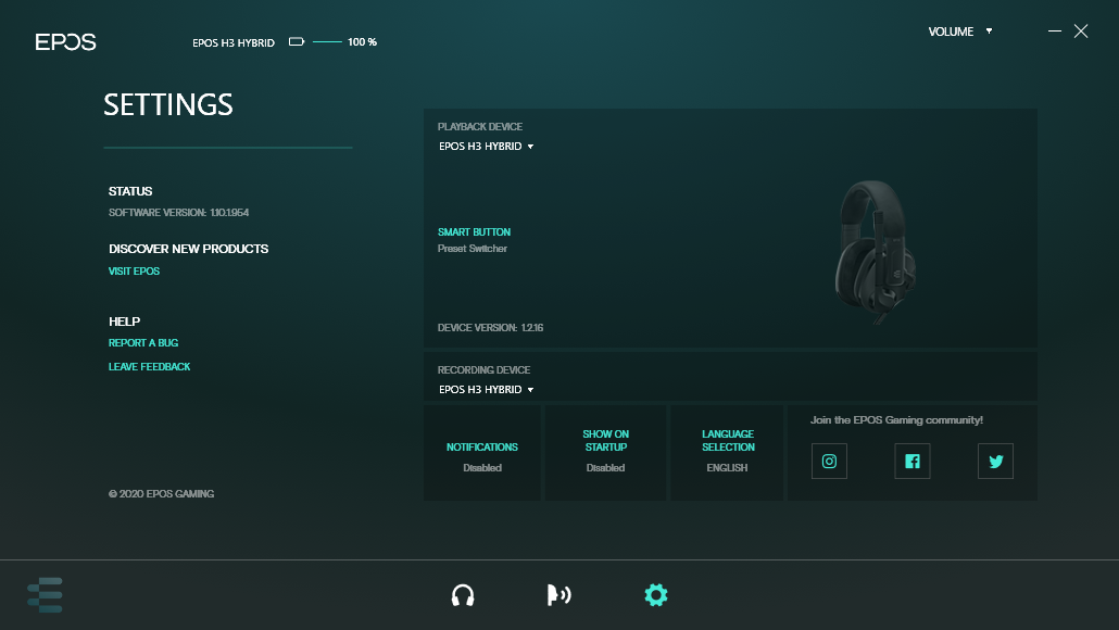 Khi kết nối với máy tính bằng cổng USB Type-C thì ta có thể sử dụng EPOS Gaming Suite để điều khiển các tính năng của tai nghe, bao gồm điều chỉnh nút bấm đa chức năng, chỉnh EQ âm thanh và EQ của microphone và cuối cùng là cập nhật firmware tai nghe cho cần thiết.