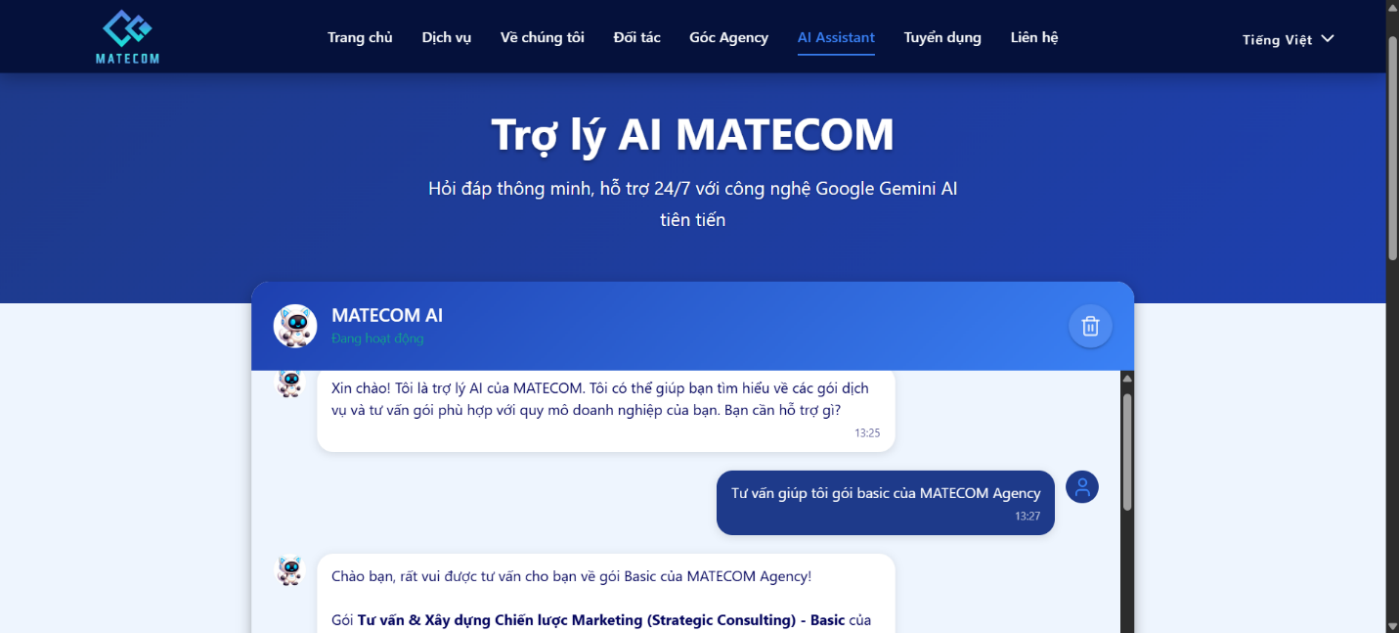 Giao diện Hệ thống AI tư vấn tự động tại Website của MATECOM Agency