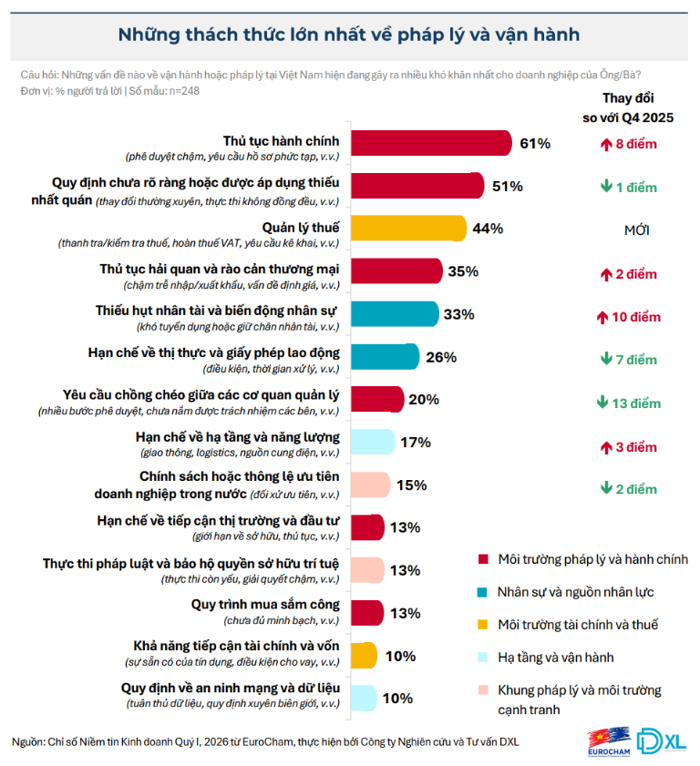 Rào cản hành chính vẫn là trở ngại hàng đầu. Trong khảo sát mới nhất, 61% doanh nghiệp xác định "thủ tục hành chính" là thách thức cốt lõi. Theo sát là tình trạng "quy định chưa rõ ràng hoặc được áp dụng thiếu nhất quán", cũng như các nút thắt trong "quản lý thuế", lần lượt được báo cáo bởi 51% và 44% số người tham gia khảo sát.