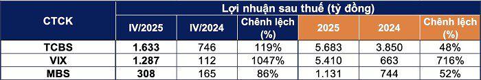 Trong mùa công bố báo cáo tài chính quý IV/2025, MBS, VIX và TCBS là những công ty chứng khoán đầu tiên công bố kết quả kinh doanh.
