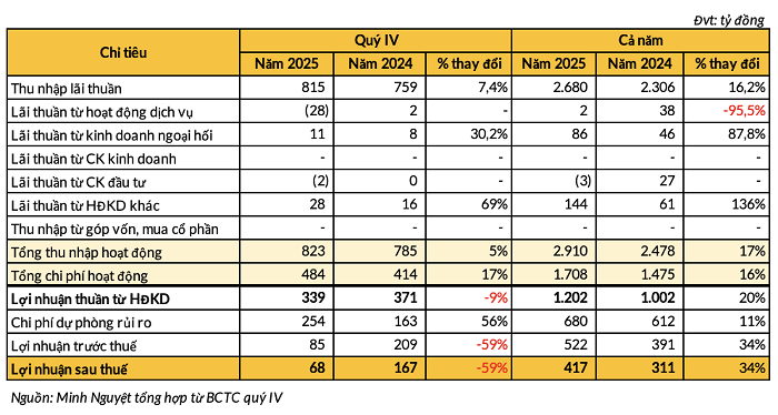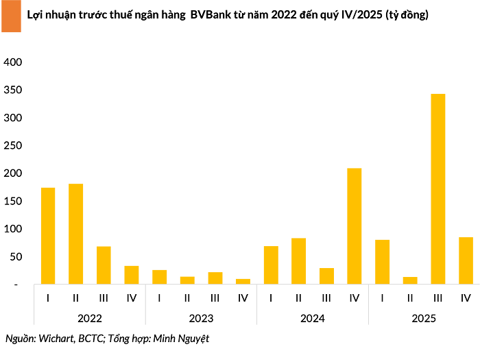 Quý IV/2025, BVBank ghi nhận lợi nhuận trước thuế giảm 59% so với cùng kỳ, đạt 85 tỷ đồng. Trong kỳ, mảng kinh doanh ngoài lãi ghi nhận kết quả không mấy khả quan khi ghi nhận giảm 69% so với cùng kỳ 2024.