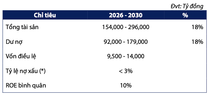 Về kế hoạch, BVBank định hướng kế hoạch giai đoạn 2026-2030 với tổng tài sản đạt 154.000 - 296.000 tỷ đồng; dư nợ dự kiến đạt 92.000 - 179.000 tỷ đồng; vốn điều lệ ở mức 9.500 - 14.000 tỷ đồng; tỷ lệ nợ xấu dưới ngưỡng 3% và ROE bình quân là 10%.