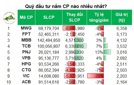 Xếp sau MWG là FPT với giá trị sở hữu hơn 5.170 tỷ đồng, song cũng ghi nhận xu hướng giảm tỷ trọng. Ngược lại, MBB và TCB lại được gia tăng mạnh về số lượng nắm giữ, lần lượt tăng thêm hơn 4,5 triệu và 6,3 triệu cổ phiếu trong tháng.