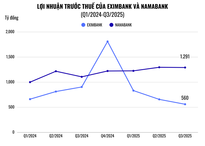 Nếu so với một số ngân hàng có quy mô vốn điều lệ gần tương đương (chẳng hạn NamABank), Eximbank cũng xếp sau về lợi nhuận. 9 tháng 2025, NamABank báo lãi trước thuế 3.811 tỷ đồng, tăng 15% svck. Về tỷ suất sinh lời, ROE trượt 4 quý gần nhất của NamABank ước đạt 19,3%, trong khi ROE trượt 4 quý gần nhất tại Eximbank là 11,8%.