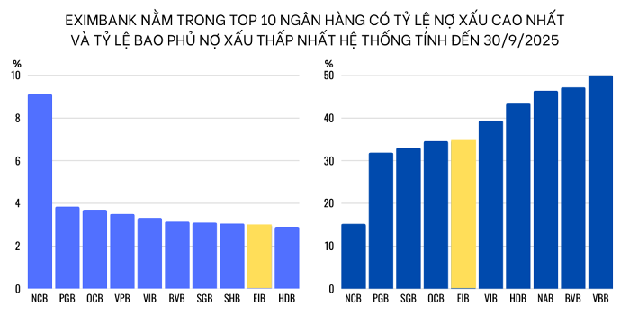 Trong khi chất lượng tài sản đi xuống, bộ đệm dự phòng tại Eximbank lại không tăng tương ứng. Tỷ lệ bao phủ nợ xấu tại Eximbank tại cuối quý III ước đã giảm xuống 35% và nằm trong top ngân hàng có bộ đệm dự phòng thấp nhất hệ thống.