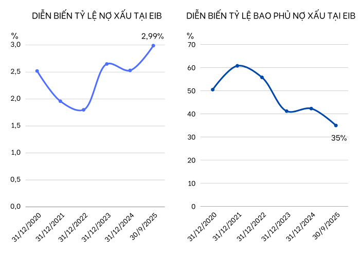 Tính đến hết quý III/2025, tỷ lệ nợ xấu (NPL) tại Eximbank đã tăng lên 2,99% từ mức 2,53% hồi đầu năm và 2,66% hồi cuối quý II; qua đó đặt ra thách thức đáng kể cho mục tiêu kiểm soát NPL dưới 1,99% mà ban lãnh đạo Eximbank đặt ra trong năm nay.