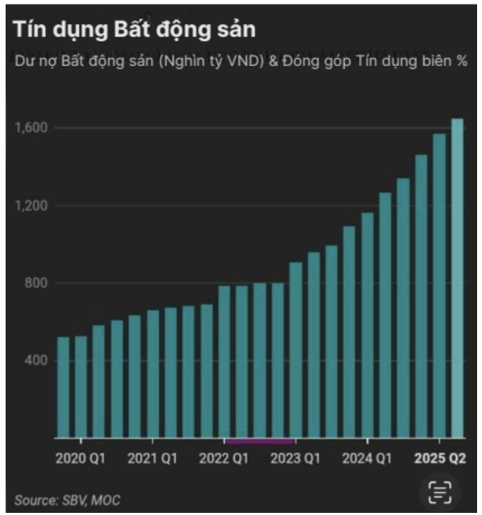 Theo báo cáo của Ngân hàng Nhà nước (NHNN), tính đến ngày 31/7/2025, dư nợ tín dụng bất động sản đạt hơn 4,1 triệu tỷ đồng, tăng 17% so với cuối năm 2024, chiếm 23,68% tổng dư nợ nền kinh tế.