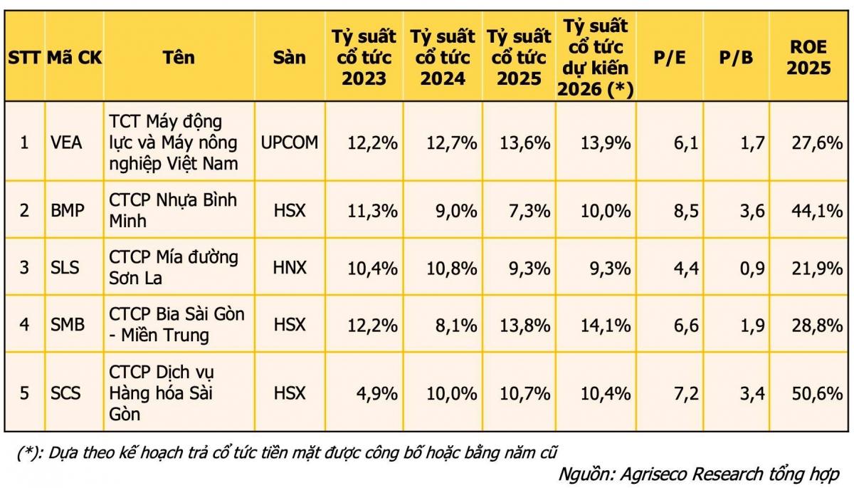 Theo tổng hợp của Trung tâm Phân tích Công ty Chứng khoán Agribank (Agriseco Research), nhiều doanh nghiệp niêm yết đang duy trì tỷ suất cổ tức tiền mặt ở mức 9-14%/năm, cao hơn đáng kể so với mặt bằng lãi suất tiền gửi. Đáng chú ý, các doanh nghiệp này đều sở hữu nền tảng tài chính vững chắc, dòng tiền ổn định và mức định giá hợp lý.