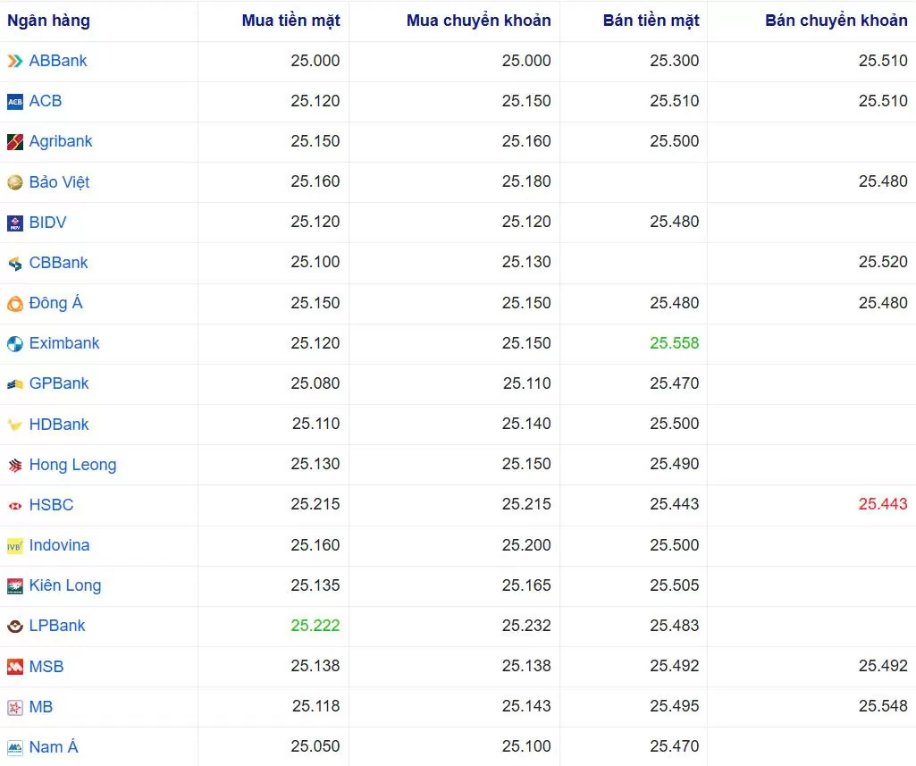 Ngân hàng HSBC đang bán chuyển khoản USD với giá thấp nhất là: 1 USD = 25.443 VND