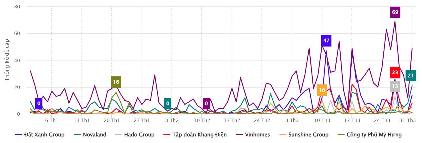 Theo báo cáo nghiên cứu và tổng hợp từ Vibiz trong quý I/2025, thị trường truyền thông ngành bất động sản tại Việt Nam tiếp tục chứng kiến một cuộc đua gay gắt giữa các thương hiệu lớn. Các tên tuổi như Vinhomes (Công ty Cổ phần Vinhomes), Phú Mỹ Hưng (Công ty TNHH Phát Triển Phú Mỹ Hưng), Sunshine Group (Tập đoàn Sunshine Group), Novaland (Công ty Cổ phần Tập đoàn Đầu tư Địa ốc No Va), Đất Xanh Group (Công ty Cổ phần Tập đoàn Đất Xanh), Hado Group (Tập đoàn Hà Đô), và Tập đoàn Khang Điền không ngừng tối ưu hóa tiềm năng của các nền tảng truyền thông trực tuyến, bao gồm mạng xã hội, website chuyên ngành và các chiến dịch tiếp thị kỹ thuật số. Mỗi thương hiệu đều xây dựng những chiến lược truyền thông bài bản, toàn diện nhằm thu hút sự chú ý và tạo dựng mối quan hệ gắn kết với khách hàng tiềm năng, từ đó củng cố vị thế trên thị trường đầy cạnh tranh.
