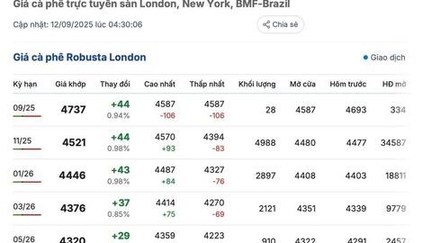 Cụ thể, trên sàn London, cập nhật lúc 4 giờ 30 phút ngày 15/9/2025, kết thúc phiên giao dịch giá cà phê Robusta tăng nhẹ so với hôm qua, dao động 4.392 - 4.817 USD/tấn. Kỳ giao hàng tháng 9/2025 là 4.817 USD/tấn; kỳ giao hàng tháng 11/2025 là 4.601 USD/tấn; kỳ giao hàng tháng 1/2026 là 4.527 USD/tấn; kỳ giao hàng tháng 3/2026 là 4.454 USD/tấn và kỳ giao hàng tháng 5/2026 là 4.392 USD/tấn.