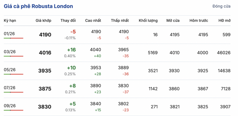 Kết thúc phiên giao dịch gần nhất, giá cà phê Robusta tại London biến động trái chiều trong các kỳ giao hàng. Cụ thể, kỳ giao tháng 1/2026 giảm nhẹ 5 USD/tấn, xuống mức 4190 USD/tấn. Trong khi đó, hợp đồng giao kỳ hạn tháng 9/2026 lại tăng thêm 5 USD/tấn, đạt mức 3830 USD/tấn.