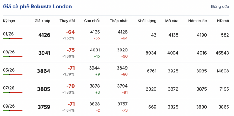 Kết thúc phiên giao dịch gần nhất, giá cà phê Robusta tại London giảm đồng loạt trong các kỳ giao hàng. Cụ thể, kỳ giao tháng 1/2026 giảm 64 USD/tấn, xuống mức 4126 USD/tấn. Trong khi đó, hợp đồng giao kỳ hạn tháng 9/2026 cũng giảm đến 71 USD/tấn, đạt mức 3759 USD/tấn.