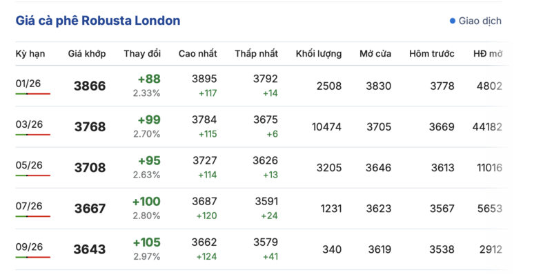 Trên sàn New York, giá cà phê Arabica cũng ghi nhận tăng liên tục trong các kỳ giao hàng. Cụ thể, kỳ giao tháng 3/2025 tăng 6,7 cent/lb, đạt mức 347,35 cent/lb. Hợp đồng giao tháng 12/2026 tăng 6,65 cent/lb, đạt mức 310,25 cent/lb.