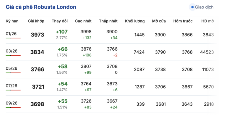 Kết thúc phiên giao dịch gần nhất, giá cà phê Arabica Brazil cũng tăng đồng loạt so với phiên giao dịch trước. Cụ thể: kỳ giao hàng tháng 3/2026 đạt mức 426,5 cent/lb, tăng nhẹ 3,65 cent/lb so với hôm qua. Trong khi đó, kì giao hàng tháng 12/2026 tăng mạnh 5,45 cent/lb, đạt mức 382,55 cent/lb.