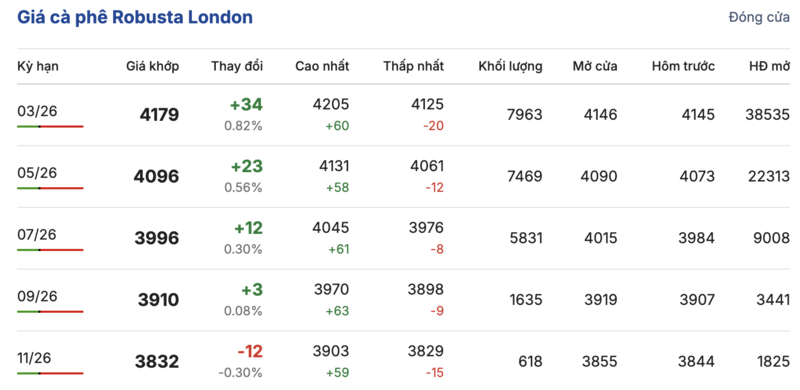 Kết thúc phiên giao dịch gần nhất, giá cà phê Robusta tại London biến động trái chiều trong các kỳ giao hàng. Cụ thể, kỳ giao tháng 1/2026 phục hồi, tăng nhẹ 34 USD/tấn, lên mức 4179 USD/tấn. Trong khi đó, hợp đồng giao kỳ hạn tháng 9/2026 lại giảm 12 USD/tấn, đạt mức 3832 USD/tấn.