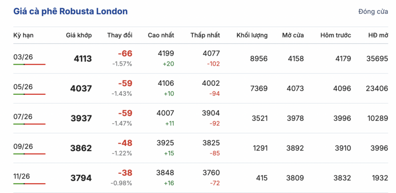 Kết thúc phiên giao dịch gần nhất, giá cà phê Robusta tại London sụt giảm đồng loạt trong các kỳ giao hàng. Cụ thể, kỳ giao tháng 1/2026 đảo chiều giảm đến 66 USD/tấn, xuống mức 4113 USD/tấn. Trong khi đó, hợp đồng giao kỳ hạn tháng 9/2026 cũng giảm nhẹ 38 USD/tấn, đạt mức 3794 USD/tấn.