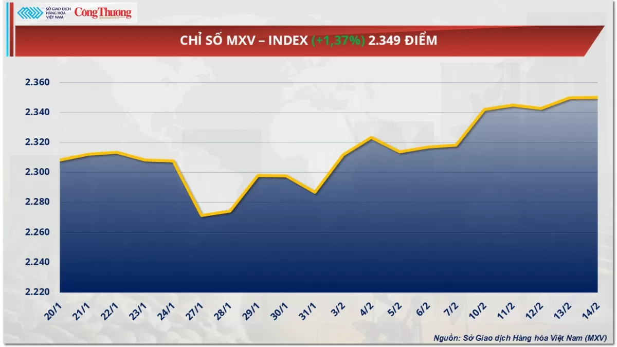 Sở Giao dịch Hàng hóa Việt Nam (MXV) cho biết, thị trường hàng hóa nguyên liệu thế giới biến động rất mạnh trong tuần giao dịch vừa qua (10 - 16/2). Nhóm nguyên liệu tiếp tục tạo điểm nhấn khi giá toàn bộ 9 mặt hàng trong nhóm đồng loạt tăng mạnh. Trong đó, cà phê thu hút mạnh mẽ dòng tiền đầu tư. Bên cạnh đó, trên thị trường kim loại cũng chứng kiến đà khởi sắc bởi tác động đan xen của các yếu tố vĩ mô và cung cầu. Đóng cửa tuần, lực mua chiếm áp đảo kéo chỉ số MXV-Index tăng gần 1,4% lên mức 2.349 điểm.