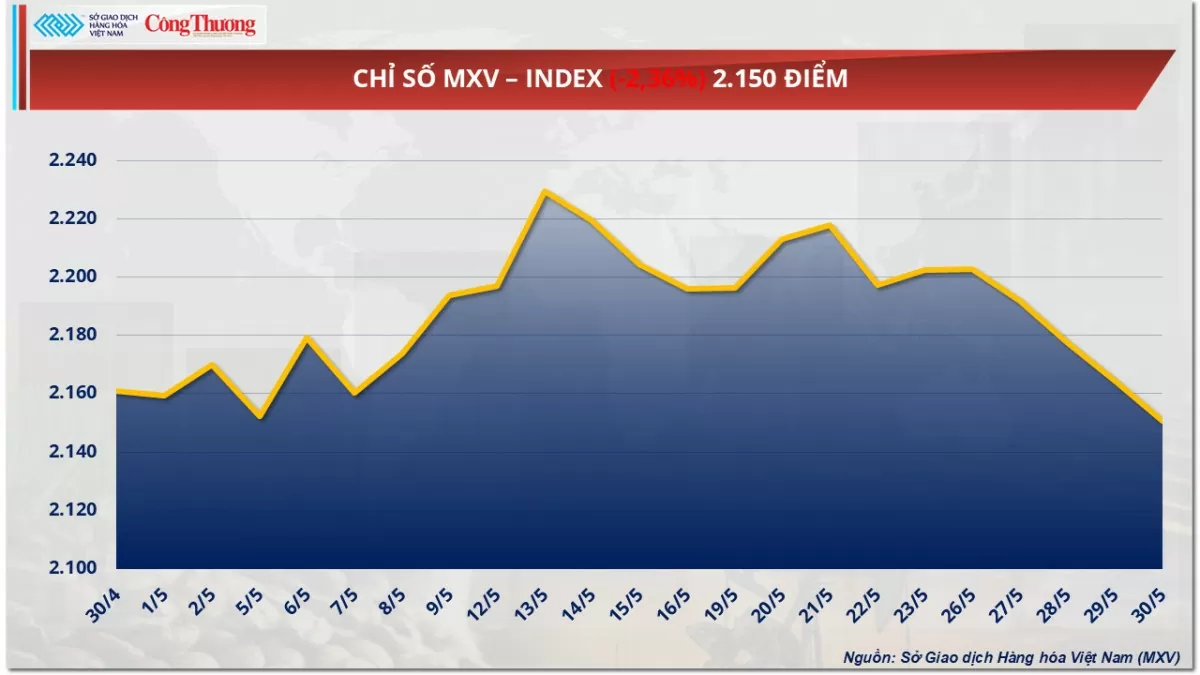 Sở Giao dịch Hàng hóa Việt Nam (MXV) cho biết thị trường hàng hóa nguyên liệu thế giới chìm trong sắc đỏ trong tuần giao dịch vừa qua. Với 4 phiên liên tiếp giảm, đóng cửa ngày giao dịch cuối tuần (30/5), chỉ số MXV-Index rơi 2,36% xuống 2.150 điểm. Đáng chú ý, lực bán rất mạnh khiến trên thị trường năng lượng đã dẫn đà suy yếu của toàn thị trường. Diễn biến đồng pha, trên thị trường nguyên liệu công nghiệp, nhiều mặt hàng như cà phê, cao su… giảm sâu tới hơn 5%.